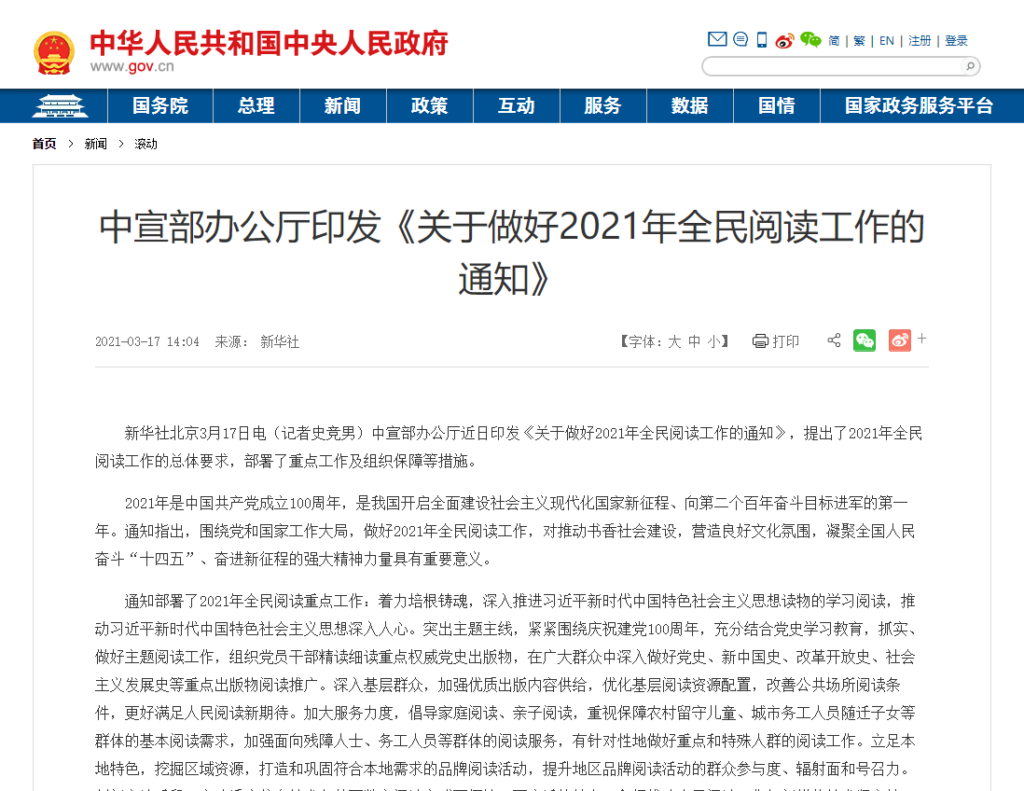 3月17日,中宣部办公厅印发《关于做好2021年全民阅读工作的通知》,提出了2021年全民阅读工作的总体要求,部署了重点工作及组织保障等措施。