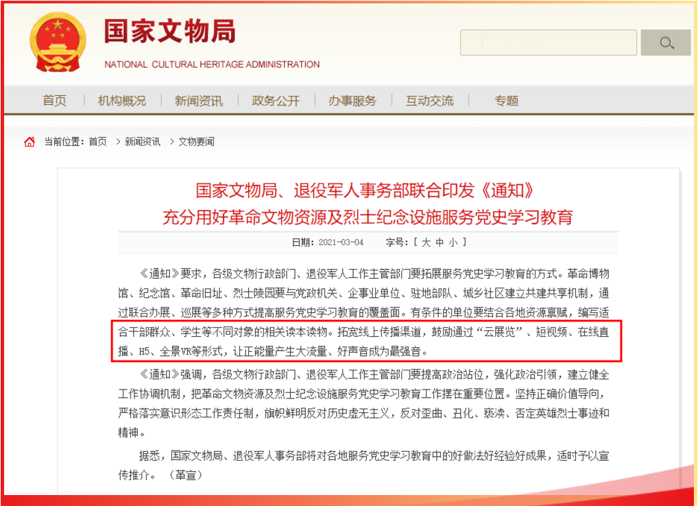 3月4日,国家文物局、退役军人事务部联合印发《关于充分用好革命文物资源及烈士纪念设施服务党史学习教育的通知》。要求各级文物行政部门、退役军人工作主管部门要拓展服务党史学习教育的方式,拓宽线上传播渠道,鼓励通过“云展览”、短视频、在线直播、H5、全景VR等形式,充分用好革命文物资源及烈士纪念设施服务党史学习教育。
