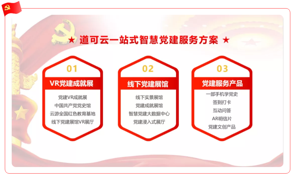 道可云以中宣部等权威机构提供的党史内容为核心,基于各企事业单位实际需求,规划建设线下党史学习纪念展馆、党建文化长廊、智慧党建大数据中心、智慧党建数字展厅,采用历史文献、珍贵影像、图片、实物、VR党建一体机、多幕融合投影等更加全面地展示中国共产党百年发展历程和各地区的党建工作、党建成果。
