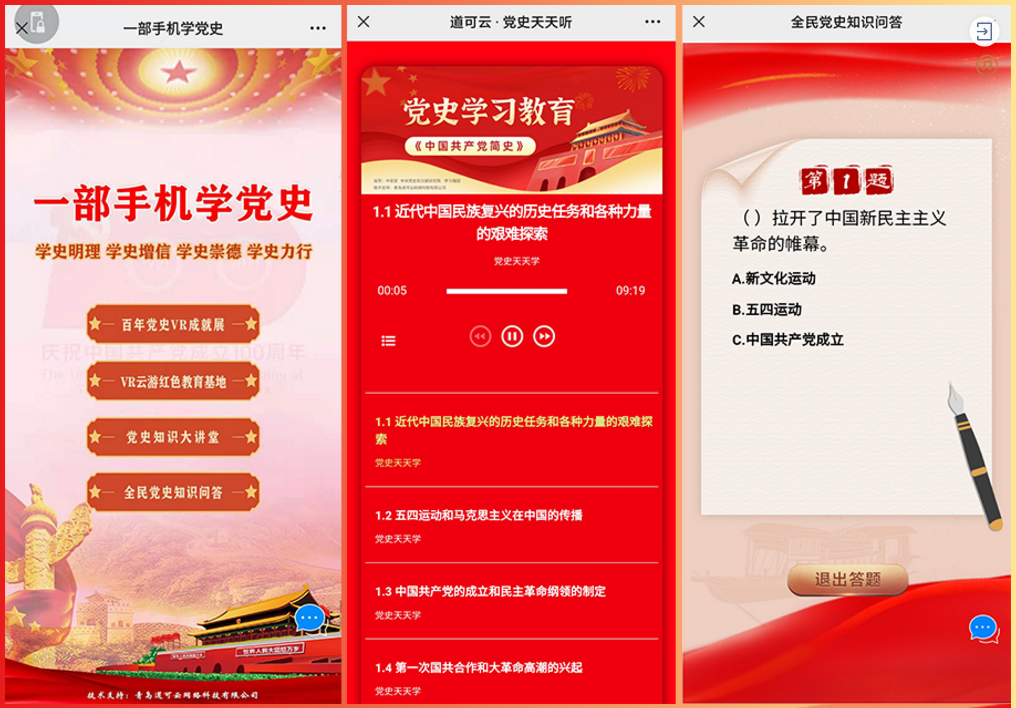 道可云依托云存储和大数据,利用VR/AR、H5、短视频等形式,拓宽线上传播渠道,推出了一部手机学党史、党史天天听、全民党史知识挑战赛、知史爱党、知史爱国“党史知识竞赛”等党建服务产品,推动全社会形成爱读书、读好书、善读书的新风尚。