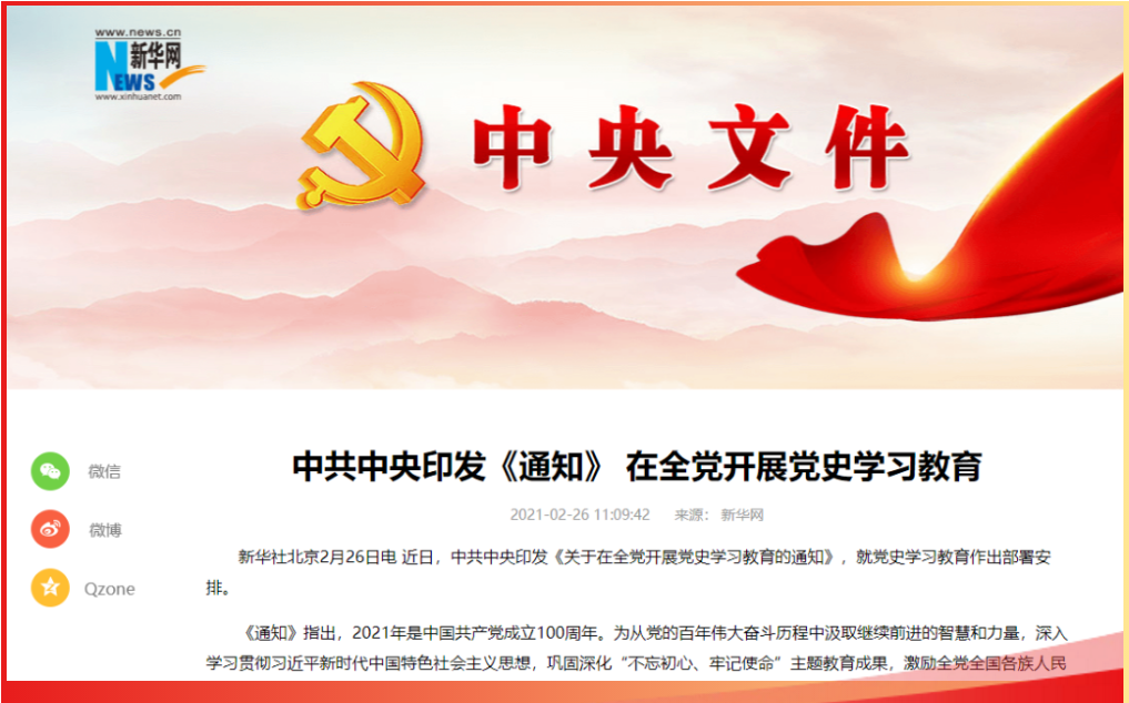 2月26日,中共中央印发《关于在全党开展党史学习教育的通知》。要求各级党委(党组)要把开展党史学习教育作为一项重大政治任务,高度重视、精心组织,在全党开展党史学习教育。