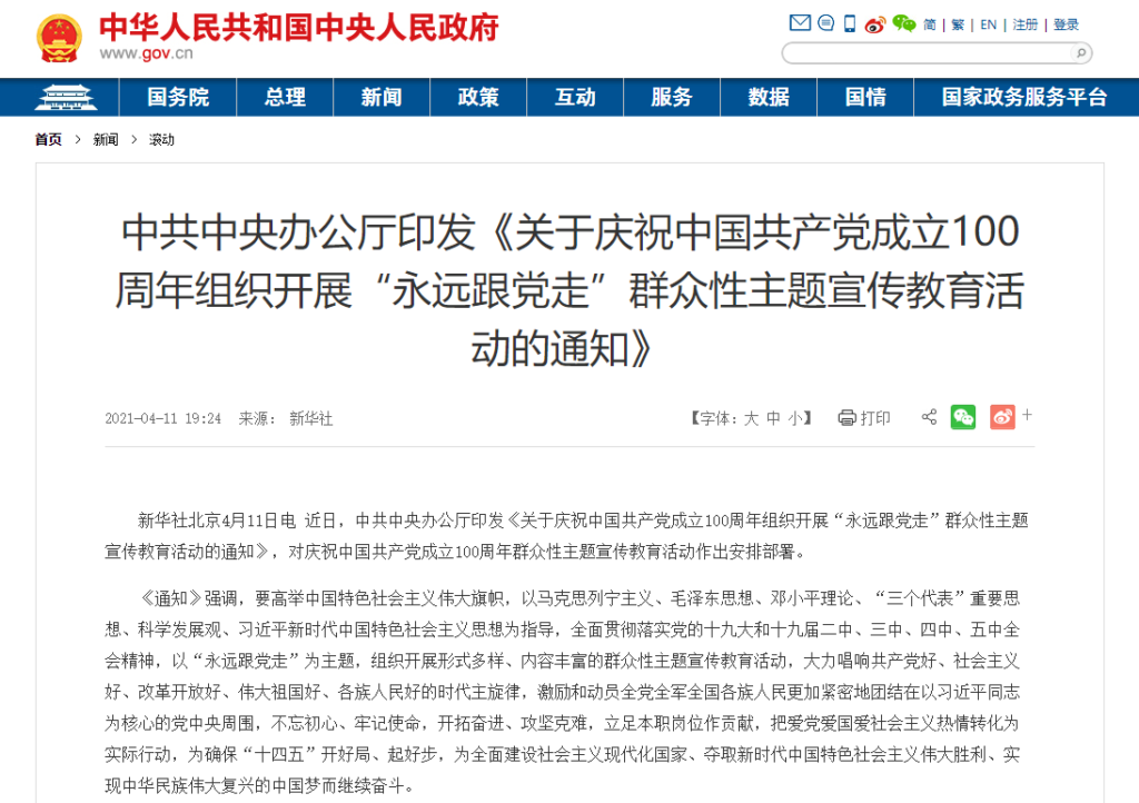 近日,中共中央办公厅印发《关于庆祝中国共产党成立100周年组织开展“永远跟党走”群众性主题宣传教育活动的通知》,对庆祝中国共产党成立100周年群众性主题宣传教育活动作出安排部署。