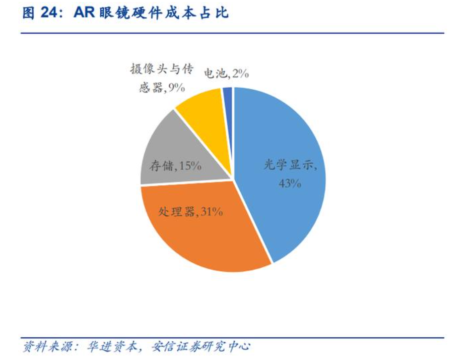 光学与显示领域仍是 AR 硬件的重要突破点,光学与显示占据 1000 美元级 AR 硬件成本的 43%。AR 眼镜的光学与显示模组包括近眼显示(即光学镜片)、微显示器及与二者相关的景深技术。光学显示是 AR 眼镜组成的核心部分,影响最终成像效果,光学显示之于 AR 眼镜 相当于屏幕之于手机。AR 眼镜其余供应链环节与智能手机重合度较高,量产及普及的壁垒 较低。