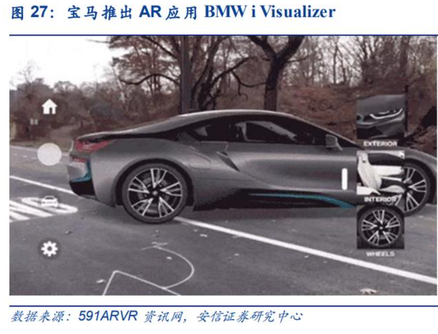 AR 开发成本降低,应用内容大幅增加。Pokemon Go 的火爆让大众第一次直观感受到 AR 的 魅力。得益于 AR Kit、AR Core 等高效开发软件,制作 AR 应用的门槛和成本大幅降低。同 时,AR 应用数量激增。AR 应用程序在 2017 年 9 月 20 日 AR Kit 正式上线之初只有五十多 款,而在 3 个月的时间就已经有超过 1000 款应用。AR 应用在内容上也呈现多样化的趋势, 既有类似 Pokemon Go 这样的 AR 游戏,也有传统制造企业与 AR 的联合,比如宝马推出的 BMW i Visualizer,乐高也发布了使用 AR Kit 的来整合数字和实物的应用 AR Studio。