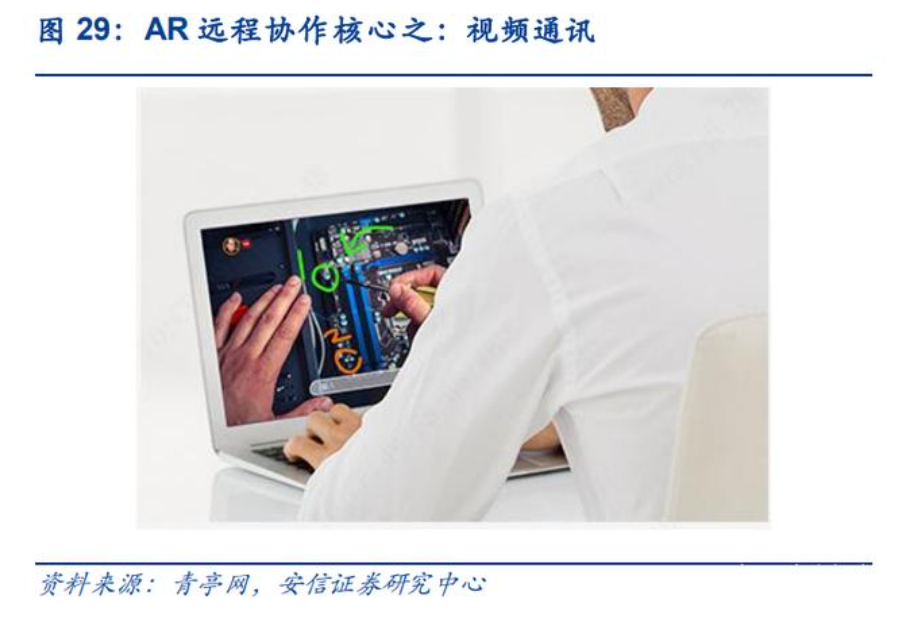 AR 产业产品形态、价格尚未达消费级水平,仍在 B 端商业场景落地。2021 年预计光波导镜 片、MicroLED 微显示屏幕良率及量产难题被突破,AR 眼镜在功耗、体积、重量、视场角会 有大幅的改善及提升,AR 眼镜将越来越接近普通眼镜形态。基于 AR 的远程协作解决方案 是 AR 在 B 端市场的重要落地场景,AR 远程协作可通过 AR 眼镜或具备 AR 功能的手机等 采集声音音频,并通过无线网络传输到后台协助端进行技术支持,具有低延迟、高画质的优 良特性。AR 产业进入 C 端市场尚待时日,需苹果、微软等巨头的推动及产业界共同努力。