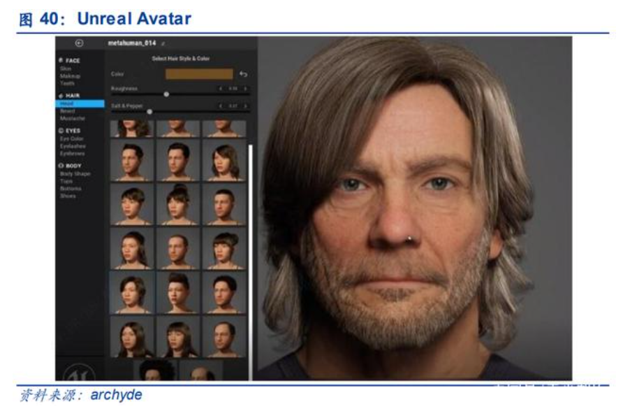2)工具软件:3D 开发工具系核心是生产与创作工具,逐步走向简单化、轻量化、可视化。目前市场核心的 3D 开发引擎包括 Unity 的 U3D、Epic Games 的 Unreal Engine,以及 Frostbite Engine 寒霜引擎、起源引擎等,主要用于游戏、影视等 PGC 的内容生产。由于 Metaverse 需要简单易用的生产工具,3D 开发工具也逐步走向简单化、轻量化、可视化, 如 Roblox 平台的开发工具 Roblox Studio,《我的世界》MC Studio 等。