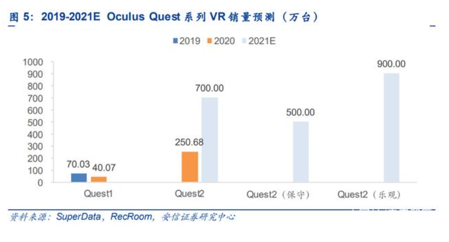 现象级消费产品 Oculus Quest 2 累计销量超出此前各代之和,预计 2021 全年销量 500~900 万台。Oculus Quest 2 作为 Facebook 最新一代 VR 一体机,上市之初即表现不俗,2020 年9月发布之初预定量就达初代 5倍。据 Facebook Reality Labs 副总裁 Andrew Bosworth, Oculus Quest 2 发售半年时间内累计销量就已经超过历代 Oculus VR 头显总和。 SuperData 统计 Oculus Quest 2 2020Q4 单季度销量达 109.8 万台;RecRoom 根据新增 用户数预测 2020Q4 单季度销量为 200-300 万台。假设 21Q1-21Q3 单季度销量维持 100 万 台,Q4 旺季销量 200 万台,得到 2021 年 Oculus Quest 2 保守预计销量 500 万台;假设 21Q1-21Q3 单季度销量维持 200 万台,Q4 旺季销量 400 万台,得到 2021 年 Oculus Quest 2 乐观预计销量 900 万台。综上,Oculus Quest 2 2021 全年销量有望达到 500~900 万台。