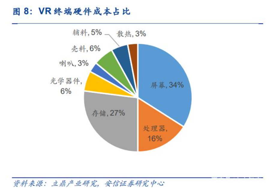 VR 终端的硬件主要由芯片处理器、屏幕及光学器件、声学器件、存储、壳料、辅料等构成。其中,芯片处理器、存储、光学显示器件在 VR 终端成本中占比较高,与智能手机重合度较高,许多领域的技术积累可以复用,硬件产业链相对比较成熟。VR 目前的主要的使用场景 是游戏及视频,以图像处理与显示为功能重点,因此硬件成本中屏幕占比 36%、光学器件占 比 6%,光学显示器合计占比约 40%;同时 VR 也需要较高的内存,存储成本占比 27%;负 责计算、渲染和图像处理的 CPU、GPU 处理器占比 16%左右。