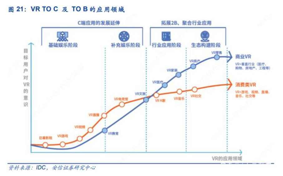 游戏之外,视频、直播、电竞、社交等商业场景亦多点开花,呈现广阔前景。根据 IDC 数 据,消费类 VR 主要包括游戏、视频、直播、影院、电竞、社交、音乐等领域,而商业类 VR 主要是教育、文旅、医疗、家装、房产、零售等。其中基础的 VR 娱乐产品如游戏、视频、 直播等需要用户具有高沉浸感,从而达到“身临其境”的体验,这对于 VR 内容的品质要求 非常高;而对于商用场景,用户对产品的关注点更多的在于能否达到相应的效果,因此,商 用 VR 的内容门槛相对用户端要低,内容制作成本也相对较低,同时一些商业模式也已经跑 通,我们预计商业 VR 将迎来高速发展。